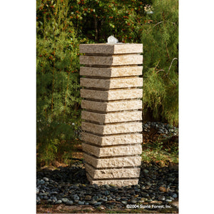 A solid block of chiseled blue-gray granite is sculpted with a twist (literally). Tiers are cut into the form, enhancing the play of water over the feature. It is also available in beige granite, as shown in the last photo.