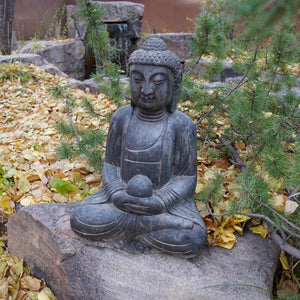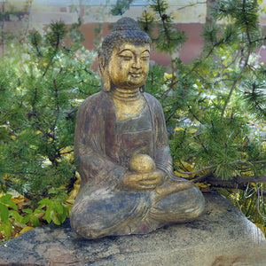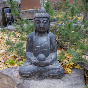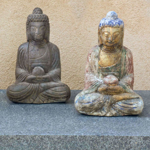 Antiqued Limestone Buddhas: Hand-carved in blue-gray limestone and then "antiqued" with either a dark or painted finish.