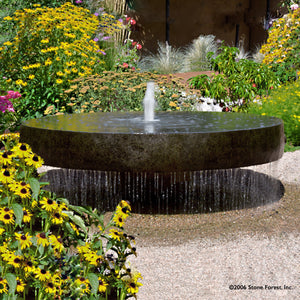 We sculpt this fountain from cross-sections of natural gray granite boulders, a play on the traditional grain millstones. The naturally weathered exterior is contrasted by a highly polished top with a slight dish to allow the water to pool. Water cascades over the sides, creating a piece that really delivers on sound.