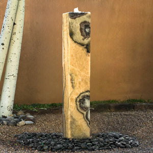 These simple geometric forms accentuate the beauty of our honey onyx with its unique vein patterns. The simple lines of each piece allow the variable color, crystalline structure, and veining of the onyx stone to shine. The slightly translucent material creates a certain iridescence in sunlight. Perfect for a contemporary garden. Cut from single blocks of stone, each piece is truly one-of-a-kind.