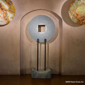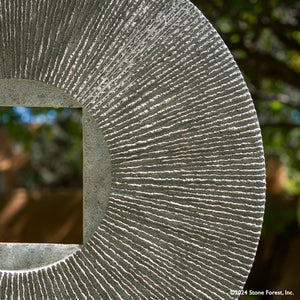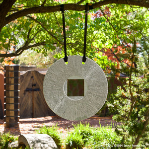 Gallery-worthy sculpture, ancient/contemporary. The blue-gray granite pendant features a ribbed pattern on both surfaces and can be used indoors or outdoors, either suspended with black webbing or on a stand