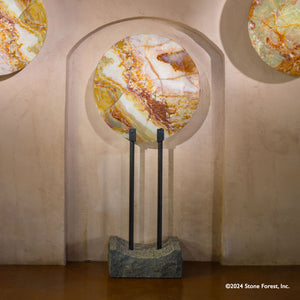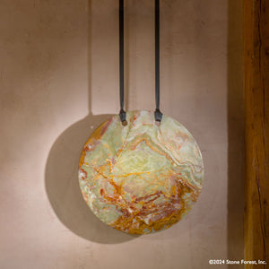 These gallery-worthy hanging sculptures are carved from blocks of premium multi-color onyx with a high-polish finish and feature a crescent design on one side. This onyx piece is meant to be displayed inside.