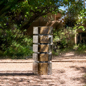 After quarrying this striking material, we highlight the piece by polishing the alternating faces of the stone while leaving the other sides natural. For sculptural appeal, we add horizontal saw cuts at intervals of 6” throughout the form.