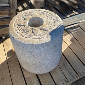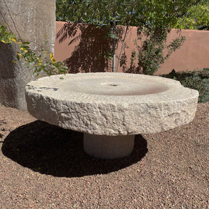 The pedestal that supports the millstone is an antique grinding stone. Both are carved from beige granite