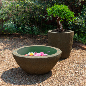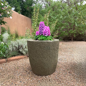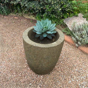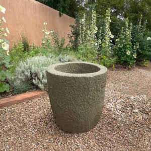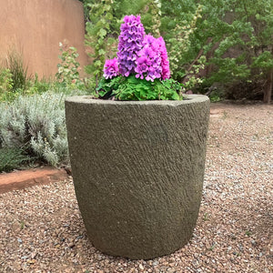 This Cylindrical Planter is hand-carved with hammer and chisel from blocks of Verde Basalt. It has a 16" deep basin.