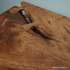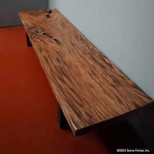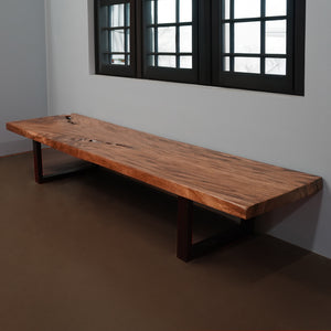 We use nature as our blueprint to craft this functional sculpture. It is hand-made from a thick slab of Acacia hardwood and reflects the unique characteristics of the tree. The bench is supported by metal legs, giving it a contemporary look. We use butterfly joints both for decoration and to control cracks.