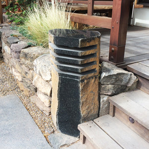 Sculpted from columns of basalt, each lantern is unique and features contrasting natural and polished facets. Perfect for lighting pathways or the entrance to your garden retreat. Core-drilled for electrical at 1.75", and has a big 10" diameter cored area in the top section to accommodate a bulb (top section is about 12" high overall). These are all one-of-a-kind.